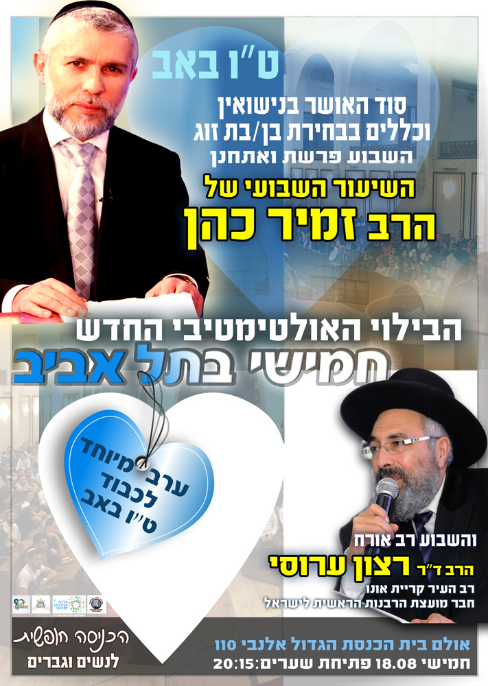 היום הזה שנקרא טו באב ובמיוחד שבמרכז העניין עומד הנושא החשוב הזה נישואין של אושר. אז יש לי שמחה גדולה לבוא לכאן. ע"פ המסורת ביהדות פותחים בשבחה של אכסניה. ראשית אנו נמצאים בבית הכנסת הגדול של תל אביב העיר הראשונה במדינת ישראל המתחדשת שיש לה היסטוריה חשובה. בכניסתי בעלותי במדרגות ראיתי תל אביב אחת ואני מוצא כאן תל אביב אחרת. זכה ידיד הרב זמיר כהן שליט"א שיסד ארגון בשם "הידברות". אין צל של ספק שההידברות בעם תגרום לכך שהפערים הגדולים הללו שאנו עדים להם יצטמצמו ונרגיש יותר ויותר מחוברים זה לזה. ההידברות פירושה לדבר אל וגם לשמוע גם ממי שמדבר אליך.אבל בימינו שלנו הערך הזה של לשמוע ולהשמיע הולך ונשחק. ואני מברך מאוד את ידידי הרב זמיר כהן שהשכיל שבמפגשים שהוא מקיים יש ערך להידברות לשמוע ולהשמיע.